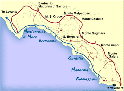 A região de Le Cinque Terre, com suas montanhas ao redor, fazem parte do Parque Nacional Cinque Terre; uma trilha de cerca de 11km liga as cidades e é o atrativo principal para os visitantes que pretendem visita-la a pé.