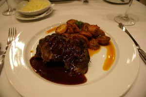 Bife con salsa tannat y papines al ajillo