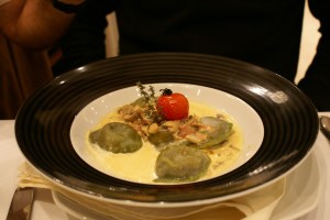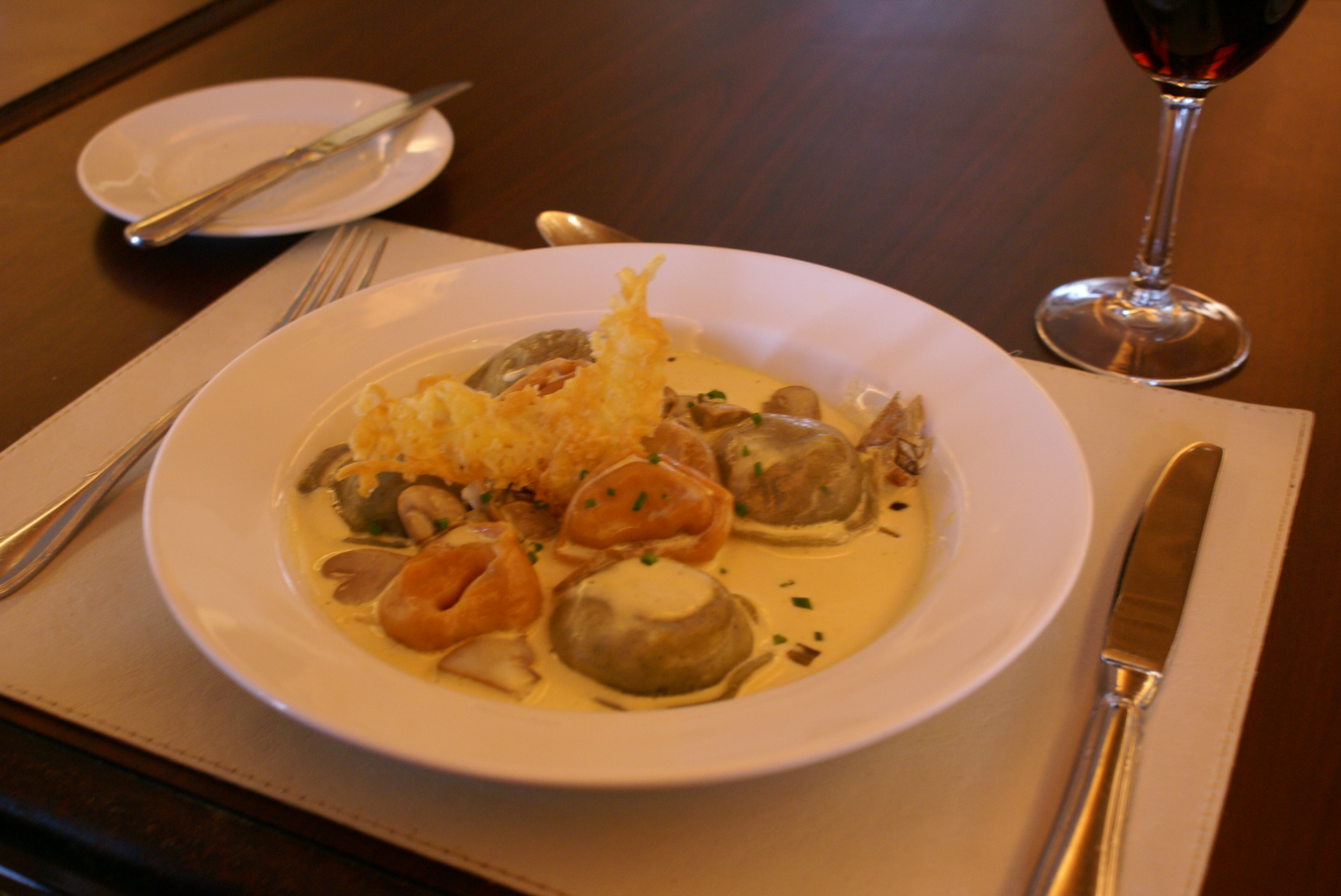 Sorrentinos de pato y calabaza en crema de hongos y queso azul