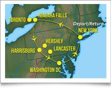 O ponto de partida deste itinerário é o Hotel Hudson em Nova Iorque com duração de 6 dias e visitando: Niágara Falls, Toronto, Niágara on the Lake, Hershey ( incluindo uma visita a fabrica de chocolate Hershey’s), Lancaster, Harrisburg, Washington DC, Mount Vernon e Arlington.