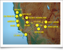 O ponto de partida deste itinerário é o Hotel Sheraton Downtown em Los Angeles com duração de 7 dias visitando: Monterey, Carmel, San Francisco, Sausalito, Muir Woods, Fresno, Sonoma County, Yosemite Park, Hoover Dam, Grand Canyon, Bryce Canyon e Lãs Vegas.