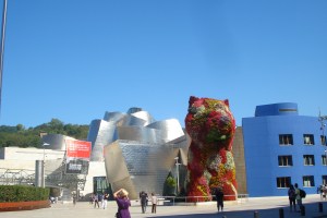 Infelizmente visitei a cidade numa segunda-feira e o museu estava fechado, no entanto a arquitetura externa já valeu a pena, sem contar a estátua do simpático cachorrinho coberto de flores que dá as boas vindas aos visitantes. Ali nas proximidades do Museu, a beira do rio Nervion, encontra-se a Ponte de Calatrava (o mesmo arquiteto que projetou a Puente de la Mujer em Puerto Madero – Buenos Aires), a qual faz parte de uma revitalização da cidade interna de Bilbao.