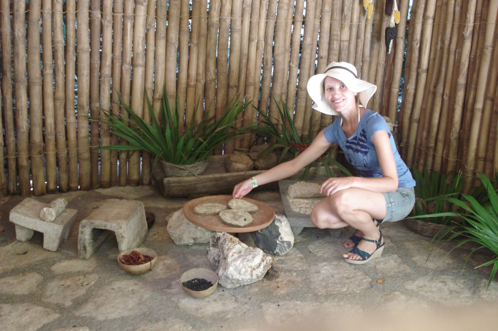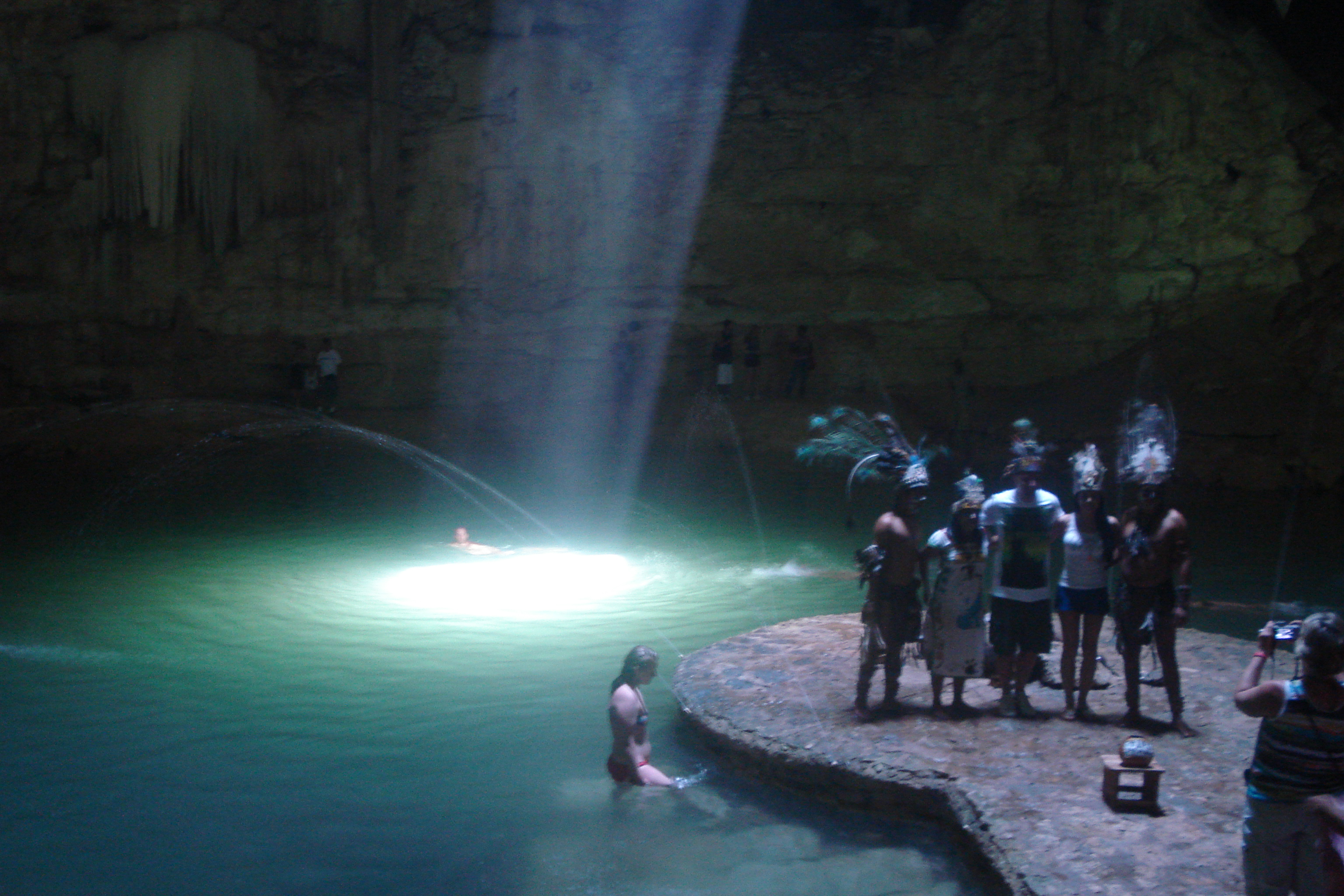 O percurso para chegar de Cancún a Chichen Itza dura cerca de 2:30, mas não pense que isso é cansativo, pois no meio do caminho fizemos uma parada espetacular em um “cenote” com direito a experimentar uma tortilla de maiz servida por uma maia vestida em seu traje típico chamado Ypil, tirar fotos dentro do “cenote” e refrescar-se naquela água fresca iluminada pelo astro maior: o Sol.