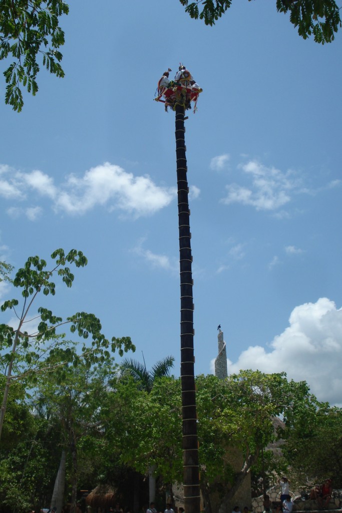 Depois fui assistir a uma apresentação dos Papantlas, os homens voadores da regiao de Vera Cruz. A representação destes homens é um rito totonaca em honra ao Deus sol ou da primavera para pedir fertilidade a terra. Ao chegar no poste eles fazem uma dança do “som do perdão” e depois quando chegam no alto dos 18 metros, representam os pontos cardeias através de aves: galo- oriente, papagaio-norte, corvo-sul e águia o leste.