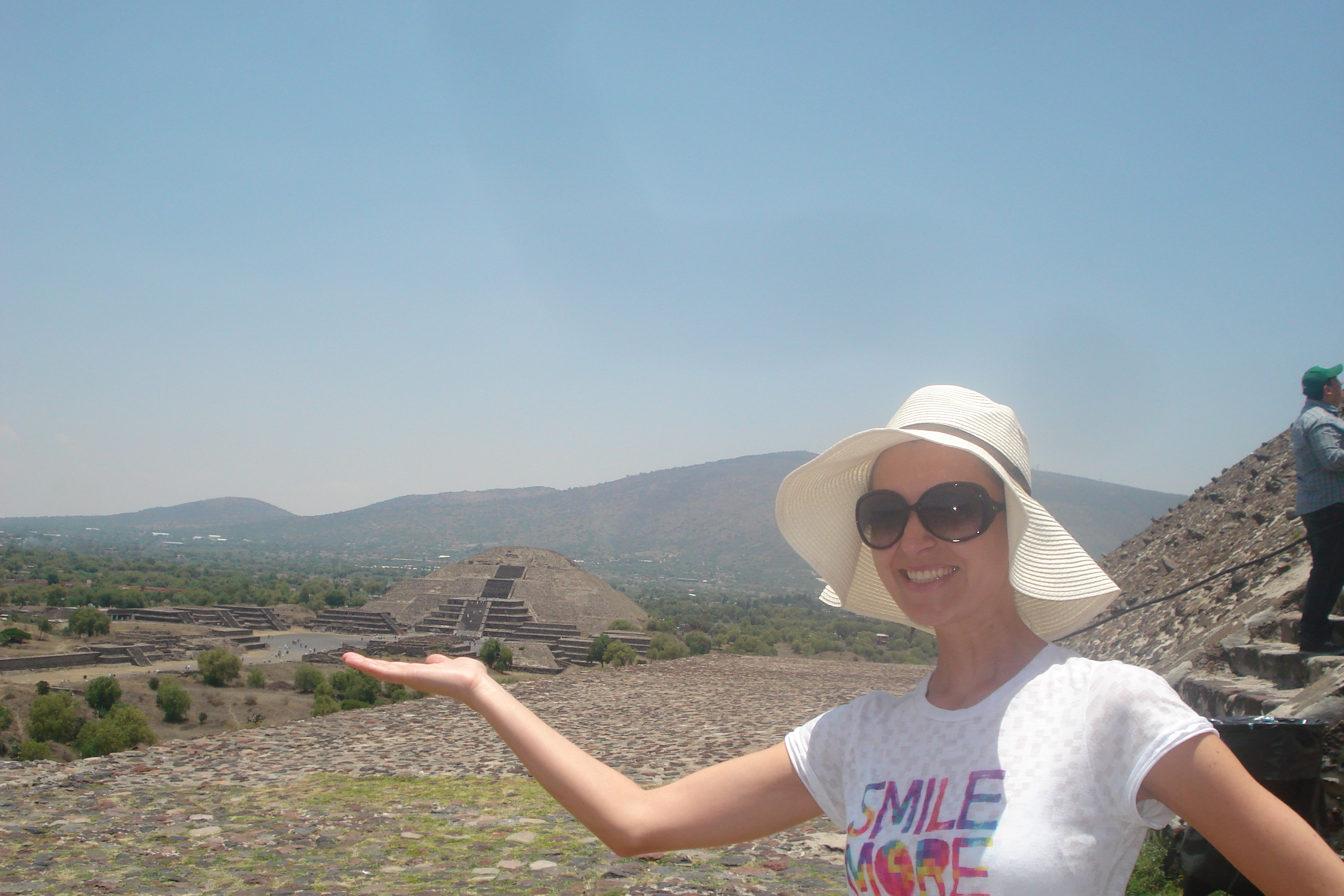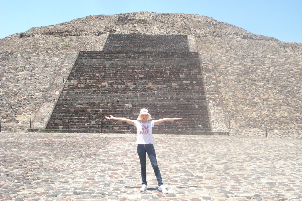 No sitio arqueológico de Teotihuacán é possível subir no alto da pirâmide do sol e da lua, e esta que vos escreve não podia perder a oportunidade de sentir esta emoção. A maior das pirâmides é a do sol e ao chegar la em cima no topo a vista é sensacional e da pra sentir muito a energia do sol entrando pelas palmas das mãos. Seguindo um pouco mais adiante esta a pirâmide da lua onde os antigos astecas realizavam os sacrifícios humanos e tomavam a bebida “pulque” feita com o cactus sagrado maghei, do qual também se extraiam as fibras para a fabricação de roupas e papel.