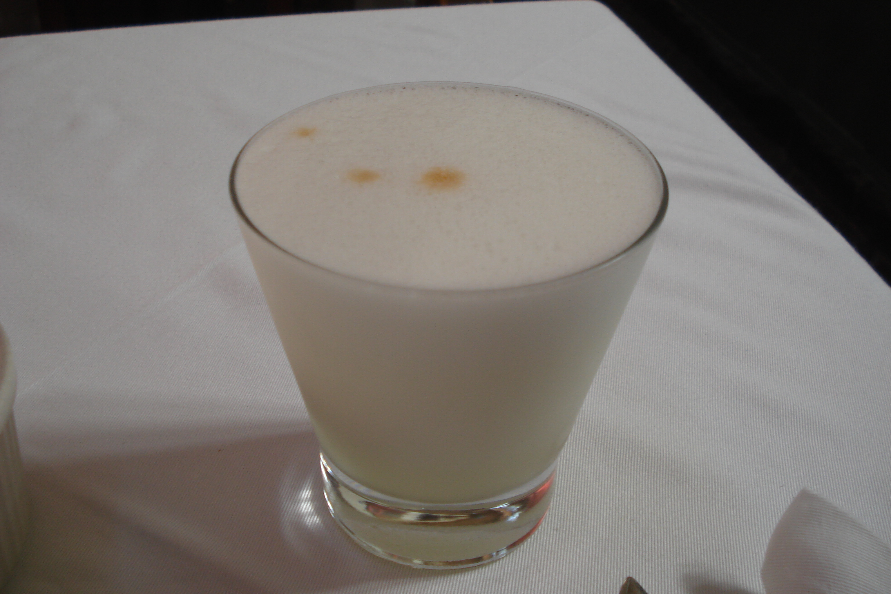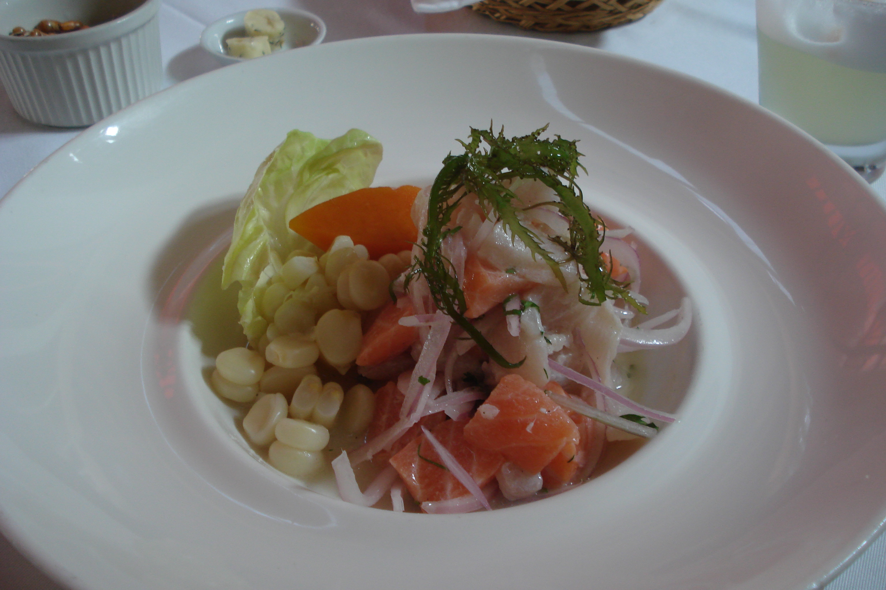 Como ainda era meio dia e o dia dos namorados não vinha ao caso, segui o conselho do taxista Jorge Moya e fui almoçar com classe no Alfresco (Malecón Bajo), um dos melhores restaurantes de Miraflores que hoje se destaca pela qualidade da sua gastronomia. Apesar de não gostar muito de peixes, provei o tradicional ceviche de linguado e salmão servido com choclo e camote (milho verde e batata doce amarela), acompanhado de um refrescante Pisco Sour , a bebida tradicional peruana feita com pisco, limão e clara de ovo batida (36 soles) e só tenho uma coisa a dizer: D E L I C I O S O!!!