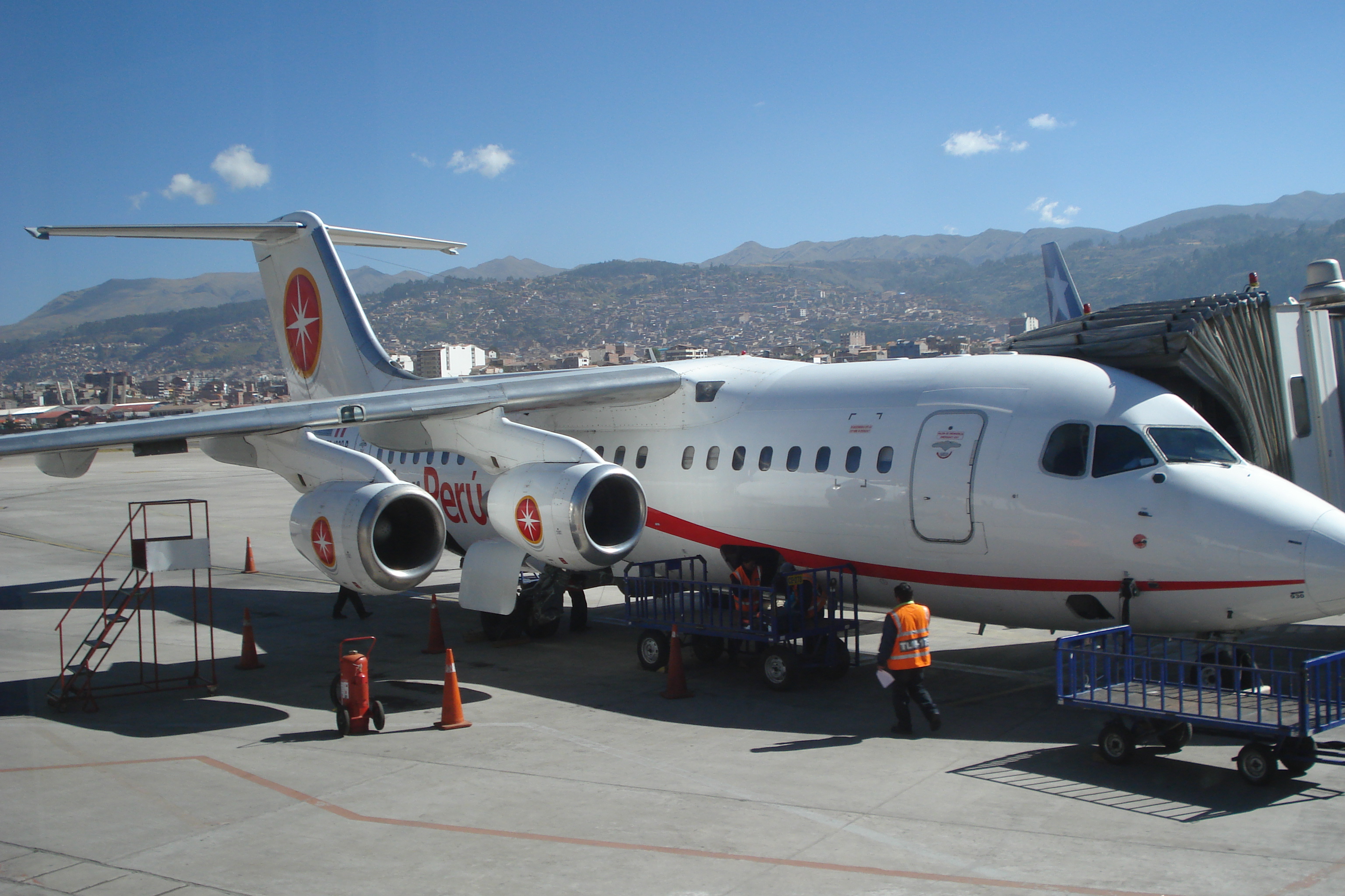 Quanto ao voo com a Star Peru, digamos que a aeronave é bem pequena e um tanto quanto claustrofóbica, mas é confortável e ainda nos serviram um lanchinho com croissant recheado com patê, bolinho, água, suco e café e depois de 1h de voo agradável sem nenhuma turbulência ainda ganhamos uma balinha de cortesia e chegamos ao aeroporto de Cusco onde acontecia um treinamento de segurança em caso de terremoto. Isso mesmo, mal cheguei e constatei que esta é uma área sujeita a tremores.