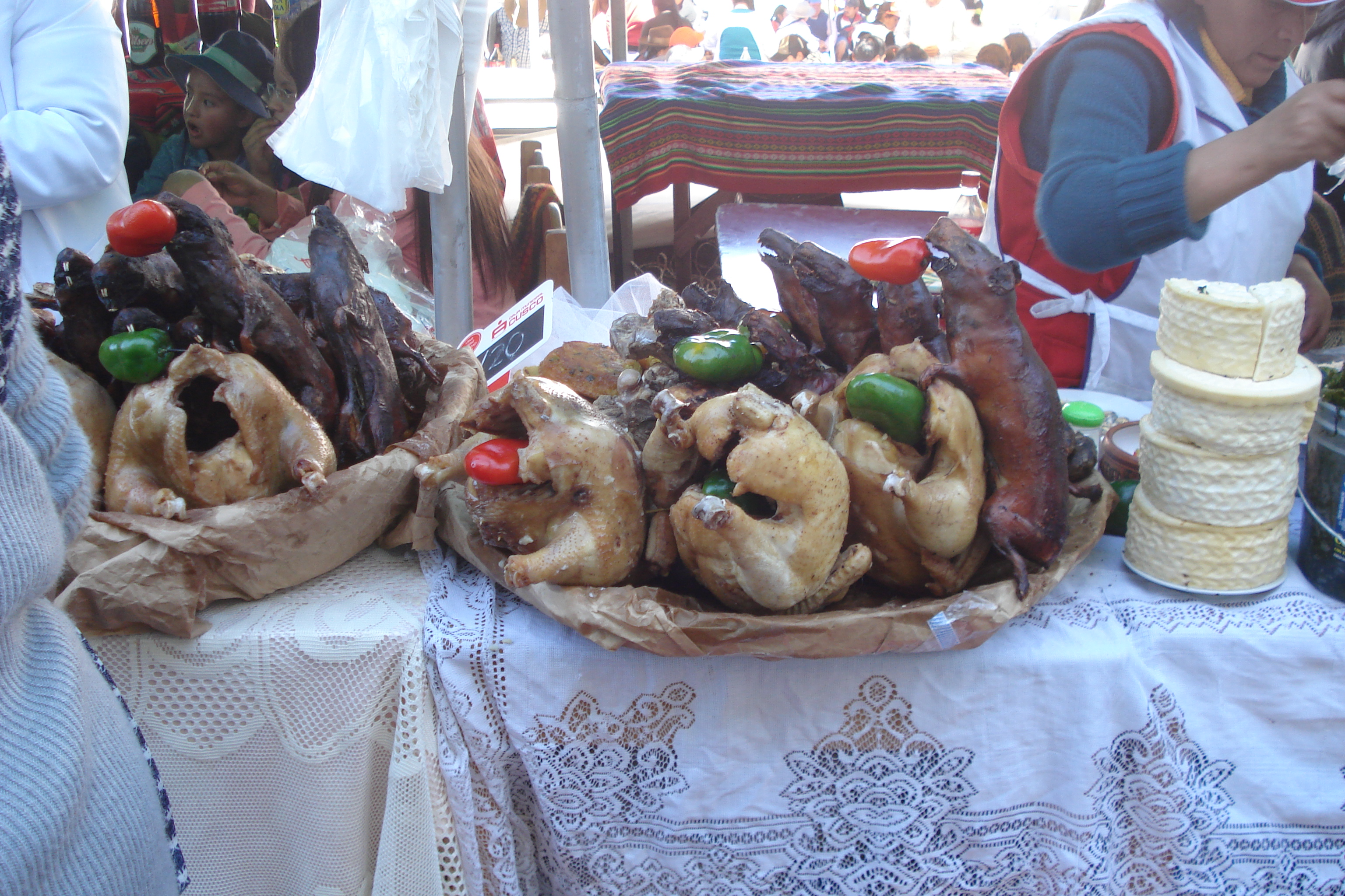 Depois de me acomodar fui rapidamente até a Praça de Armas que fica a poucas quadras do hotel e encontrei um cenário abençoado: celebração de Corpus Christi, praça lotada de fiéis e turistas, uma missa com coro e cânticos inclusive no idioma quéchua e uma emoção grandiosa sob o sol dos Andes peruanos. Depois das bênçãos a procissão seguiu pelas ruas de Cusco e pela tarde a multidão de pessoas aglomeraram-se nas praças da cidade para provar uma iguaria típica servida somente neste dia: o CHIRIUCHI, uma seleção de carnes frias de frango, boi, cui, salsicha de gostos duvidosos, além de queijo, algas, ovos de peixe e um bolinho frito (20 soles).