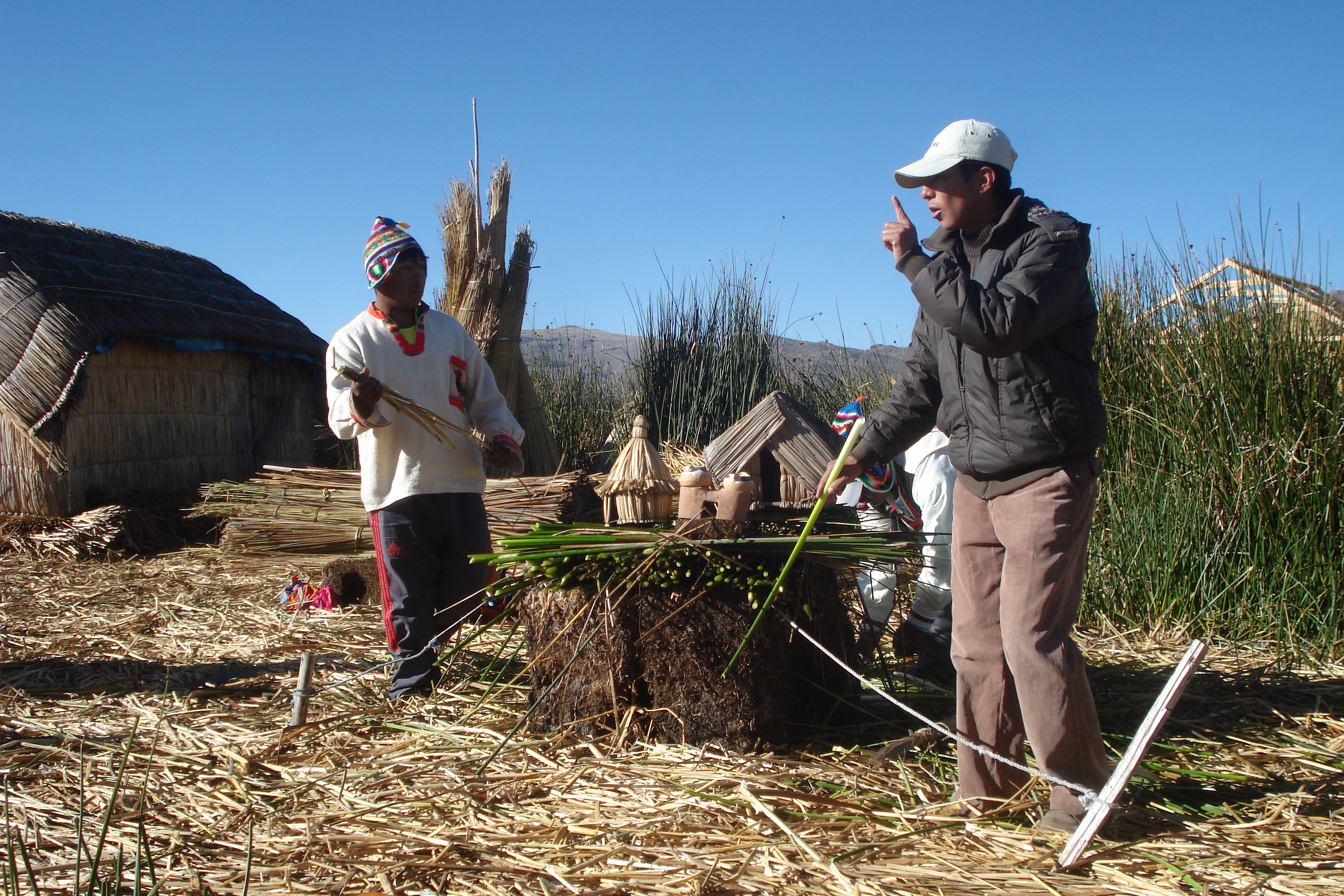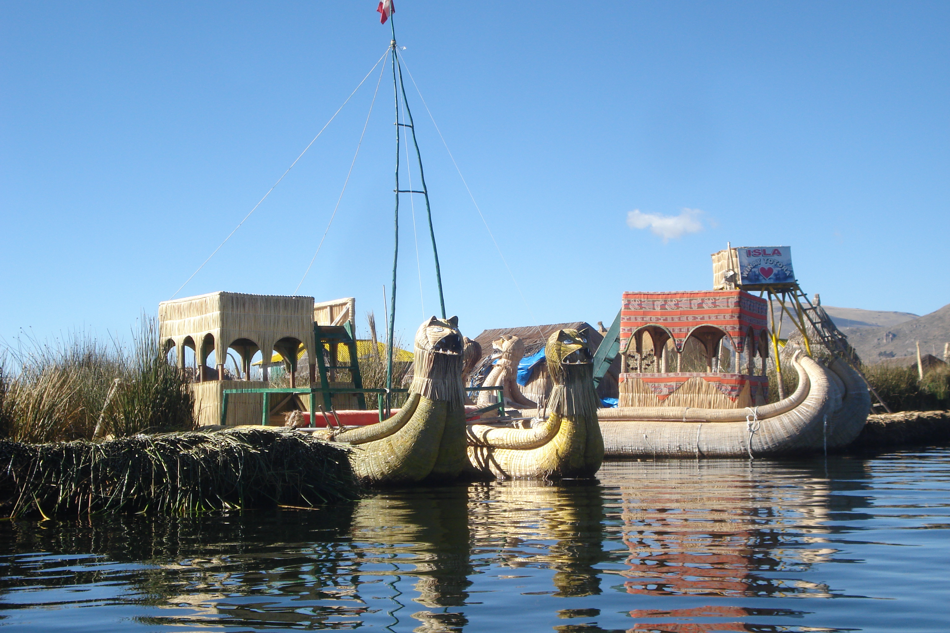 Logo ao chegar em Uros, os moradores recebem a embarcação de visitantes com a saudação no idioma indígena aimara: Kumbi Saraki (“oi, como vai?”) e após a explicação do guia de como a ilha foi construída, fomos convidados pelos moradores para conhecer suas casas, seu modo de vida e seus artesanatos e embarcamos em um barquinho de totora (10 soles) para dar um passeio de uma ilha à outra e sentir a emoção de viver por algumas horas flutuando pelo lago.