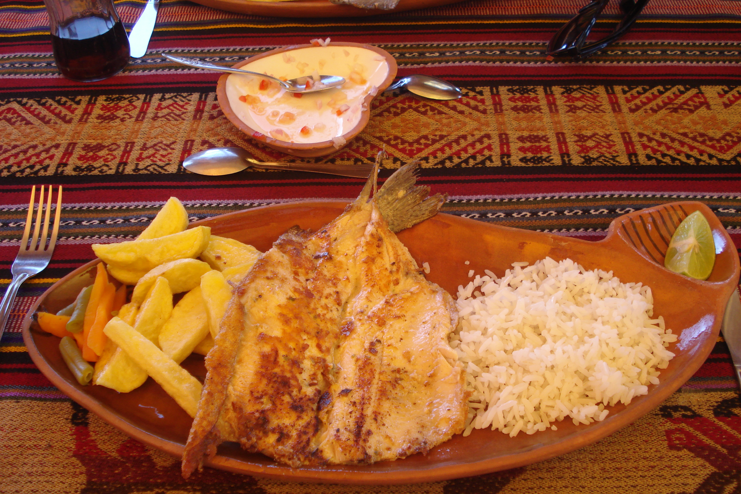 E foi pensando nesta qualidade de vida e com uma lindíssima vista para o Lago que almoçamos no alto da ilha, degustando como entrada uma sopa de quinua, seguido de um delicioso prato de truta com arroz, batatas e legumes e para finalizar um chá quentinho de muña, para ajudar na digestão e no combate ao mal de altitude.