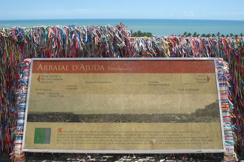 Ali mesmo no centro, logo atrás da Igreja de N. Sra. da Ajuda, fica o mirante panorâmico da cidade onde é possível avistar as principais praias de Arraial, começando pela esquerda temos Porto Seguro, a região das balsas, a Praia de Apaga Fogo, Araçaipe, Pescadores, a entrada do Eco Park e a famosa praia do Mucugê. Neste ponto de Arraial além de se ter uma vista deslumbrante do mar, das falésias, dos coqueirais e do rio que corre ao mar, podemos ver o contraste de cores das fitinhas que os visitantes deixam amarradas às grades da parte de trás da igreja com seus pedidos e suas orações. Digamos que neste pedacinho do paraíso não é de duvidar que os anjos e santos façam realmente milagres para a vida das pessoas.