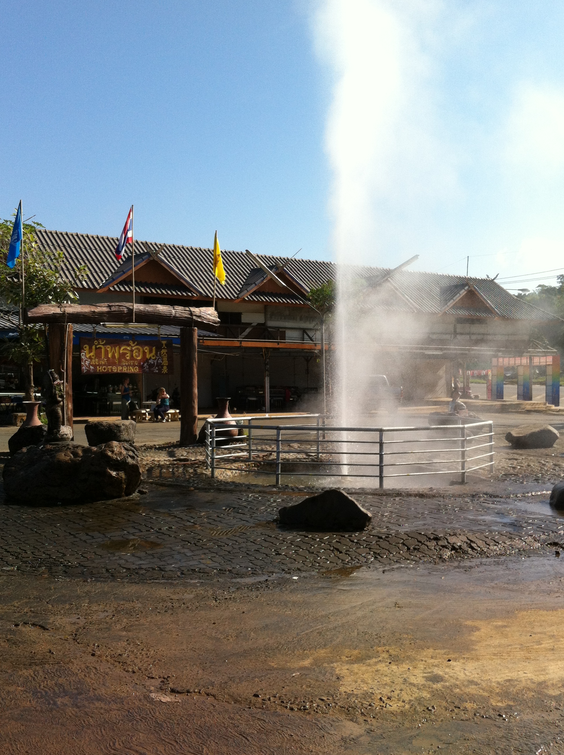 Hotspring: no caminho entre Chiang Mai e Chiang Rai a excursão faz uma pequena parada nas águas termais que jorram quentinhas das profundezas da terra, no entanto é possível apenas molhar os pés em um pequeno córrego e aproveitar o tempo livre para comprar alguns souveniers antes de seguir viagem a Chiang Rai.
