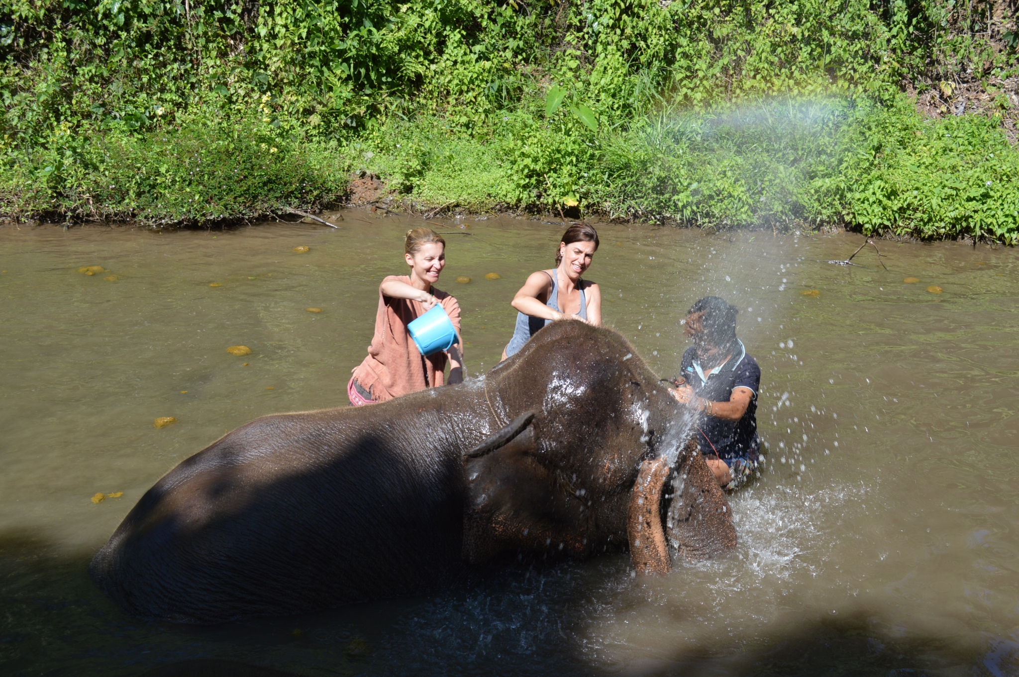 Depois do passeio é hora do almoço com direito a bolinho primavera e Pad Thai (macarrão ao estilo tailandês) e sem muitas delongas todos vão para dentro do Rio para dar banho nos elefantes. Lava daqui, esfrega com escova de lá e os elefantes parecem gostar da brincadeira, porém mal saímos do rio e lá estão eles usando suas trombas para jogar terra nas costas e se sujarem novamente. Depois de todas as peripécias com os elefantes é hora deles repousarem e os visitantes seguem até a Cachoeira de Mork-Fa para um banho super gelado e relaxante.