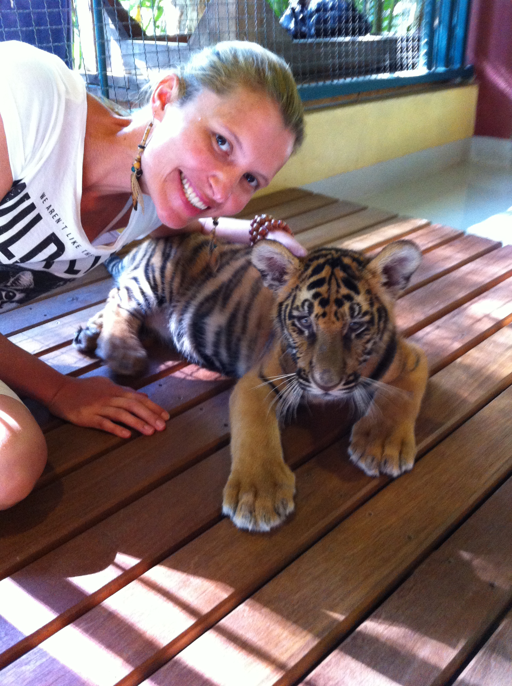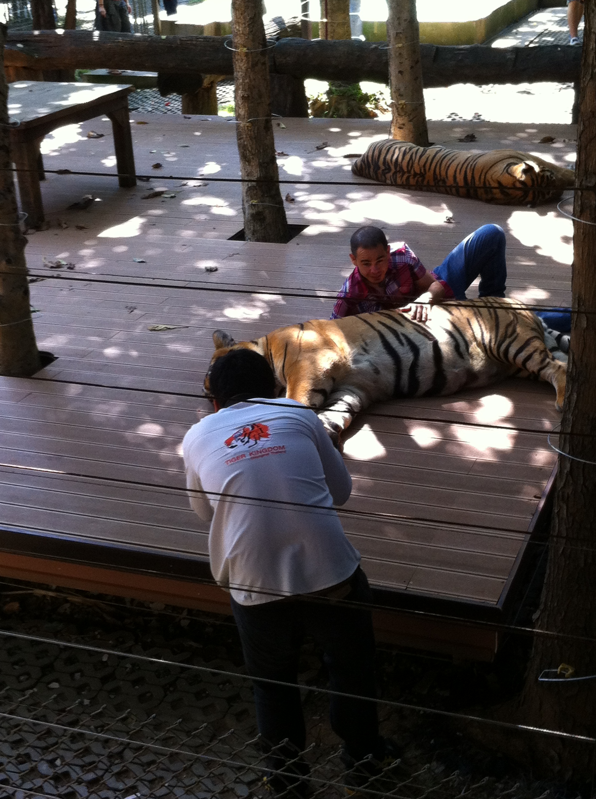 Vou ser sincera em dizer que os bichinhos são até simpáticos e brincalhões, mas ficam bem inquietos com a presença dos visitantes, enquanto alguns deles parecem estar dopados e só querem saber de dormir (apesar dos proprietários do estabelecimento jurarem que não dão nenhum tipo de sonífero para os animais). Os visitantes que querem ficar mais a vontade com os tigres ainda podem contratar um fotógrafo por 299 Bath e tirar diversas fotos com os melhores ângulos para levar para casa em um CD.
