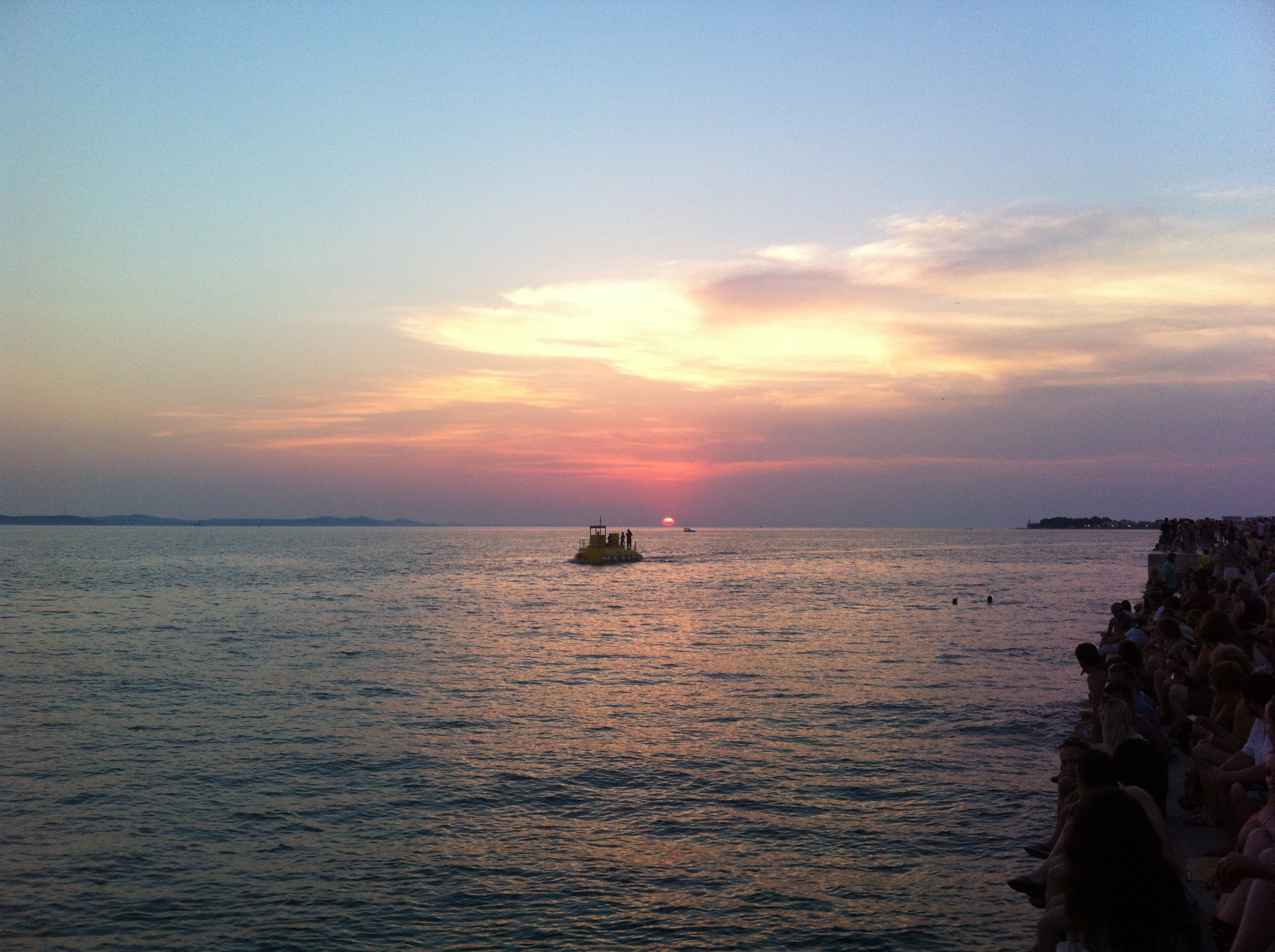 Depois de um dia inteiro de caminhada ainda deu tempo de pegar o ônibus na entrada do parque e depois de 2 horas chegar na cidade litorânea de Zadar para ver o pôr-do-sol mais lindo do mundo, segundo o cineasta Hitchcock (nos meses de verão o sol se põe por volta das 20:30). Tudo isso ao som incrível do órgão do mar, uma atração recente construída pelo arquiteto Nikola Basic em 2006 em forma de canos que usam a força das ondas para reproduzir o som do mar…um entardecer pra lá de especial…