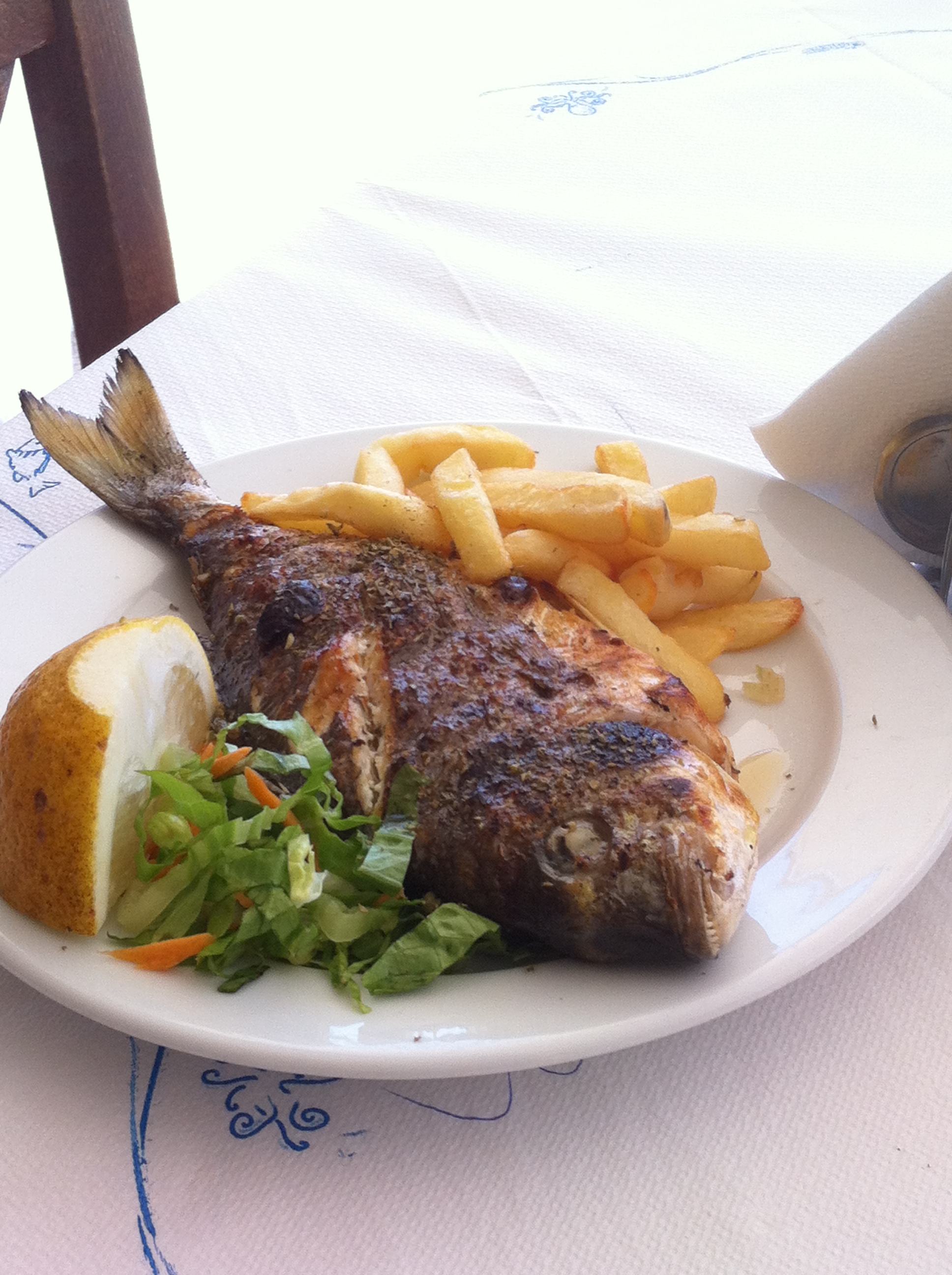 Os diversos tons de azul que confundem o céu e o mar.E se não bastassem estas belezas naturais de tirar o fôlego de qualquer mero mortal, depois de 2 horas de passeio ainda tive a tarde livre para aproveitar a pequena prainha de Ag. Nikolaos onde pude nutrir o paladar com um peixe fresco grelhado com vista para uma das paisagens mais apaixonantes da ilha: o mar simples e relaxante como só ele sabe ser. E ainda de lambuja o barqueiro me emprestou uma bicicleta velha para fazer um passeio pelos arredores do pequeno porto (e olha que a previsão era de tempo ruim heim?!)