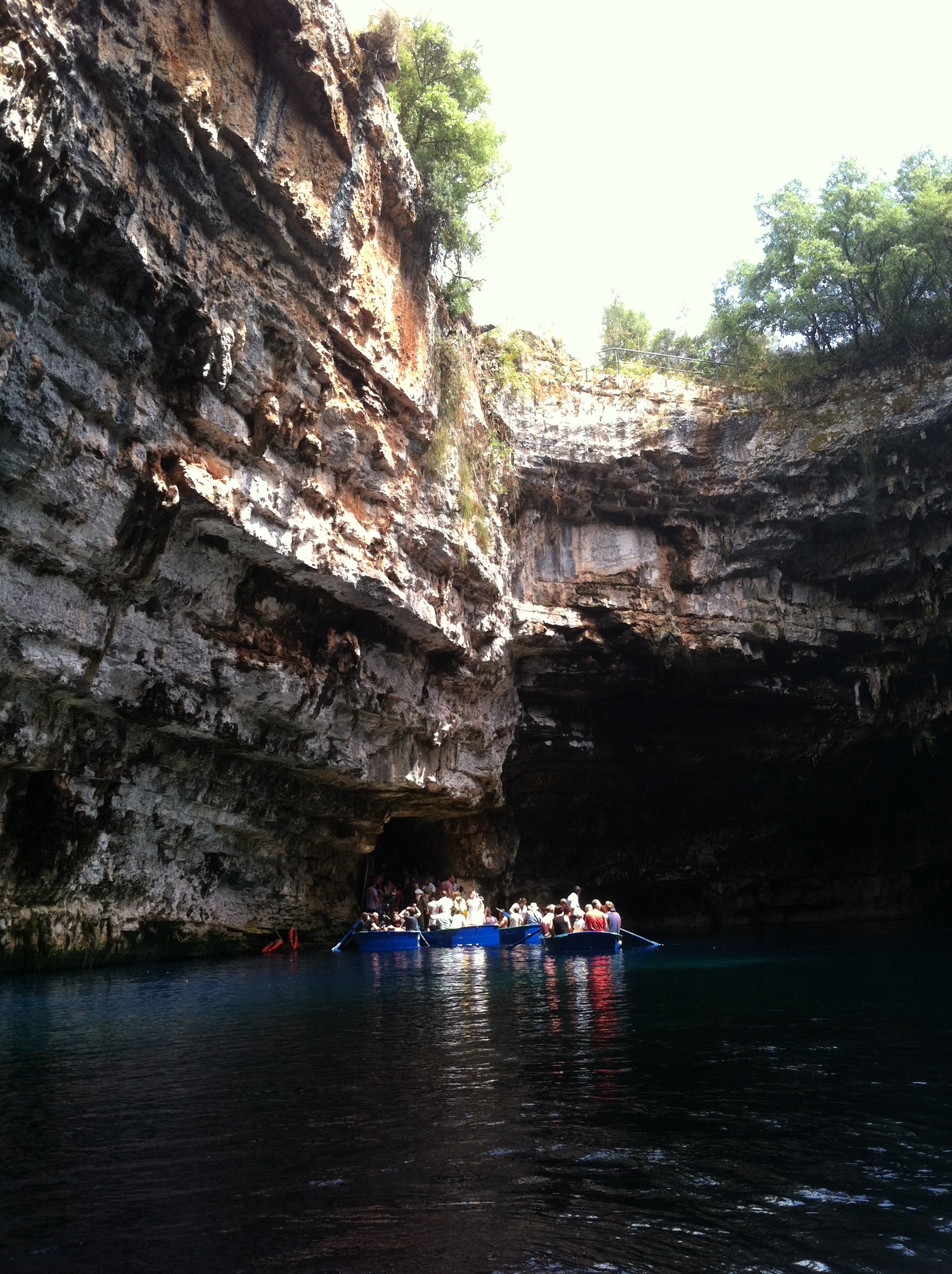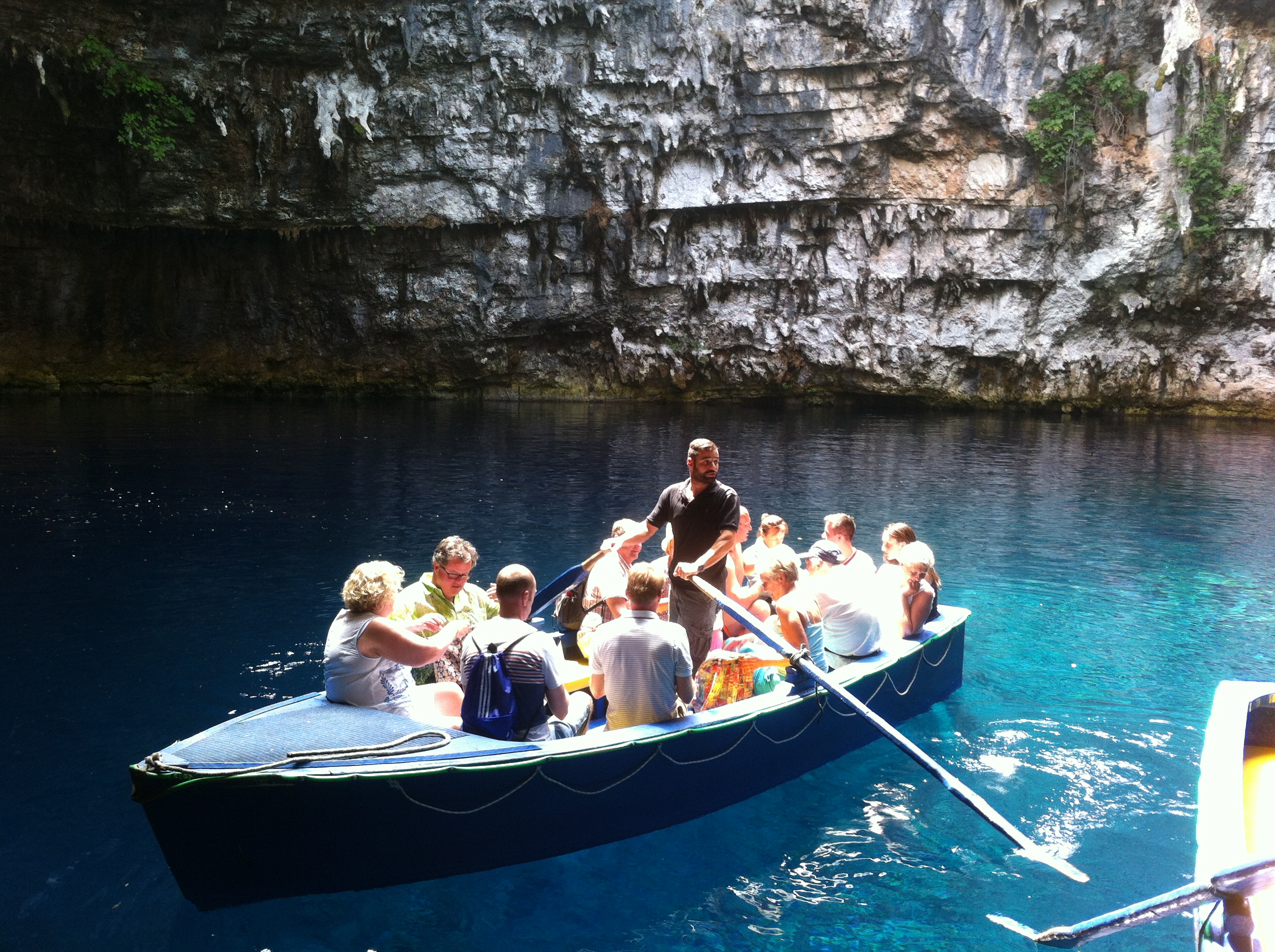 Salão principal da caverna onde os concertos são realizados.Depois de visitar Drogarati seguimos para a Caverna Melissani que fica a 2km de Sami (aberta das 09:00-17:45 – entrada 7 euros) e é formada por um lago de 39 metros de profundidade e uma caverna a céu aberto. Este lago é formado pelas águas que brotam da terra e que atravessam cerca de 17km desde Katavrothes (aquela dos moinhos que falei anteriormente). Ao entrar na caverna é possível fazer um passeio de barco pela lagoa e admirar a coloração da água que mudam de cor dependendo da incidência da luz do sol que passa pela fenda da caverna.
