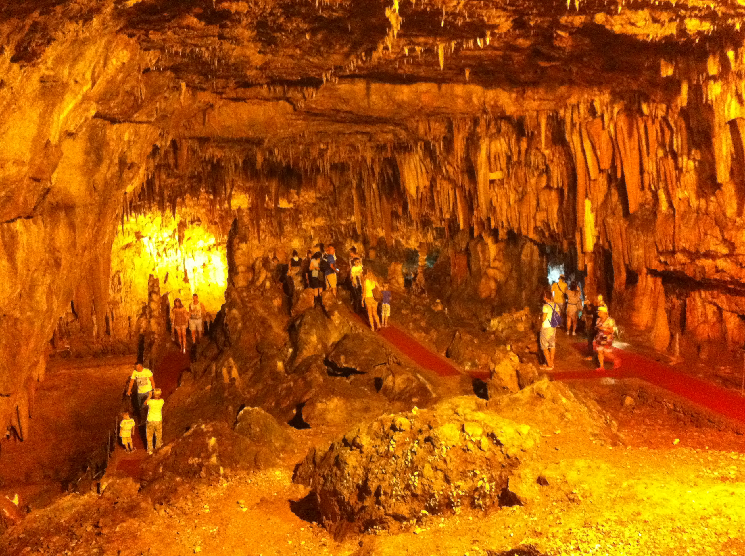 Primeiramente fomos visitar a caverna de Drogarati (aberta das 09:00 às 17:00 – entrada 5 euros) que está a 3 km de Sami a uma profundidade de 95 metros onde a temperatura gira em torno de 18ºC. Esta caverna é considerada uma das mais bonitas da Grécia e é a única dotada de uma ampla sala onde são realizados concertos clássicos com intérpretes como Irini Karaghianni. Lá dentro a natureza criou uma escultura única de estalactites e estalagmites no decorrer de milhares de anos e os visitantes podem chegar bem pertinho desta obra através de passarelas muito seguras com corrimão e tapetes no chão para não escorregar. O centro de visitantes da caverna do lado externo ainda dispõe de uma cafeteria, uma loja de souveniers e uma piscina que pode ser utilizada pelos visitantes para descansar depois da visita.