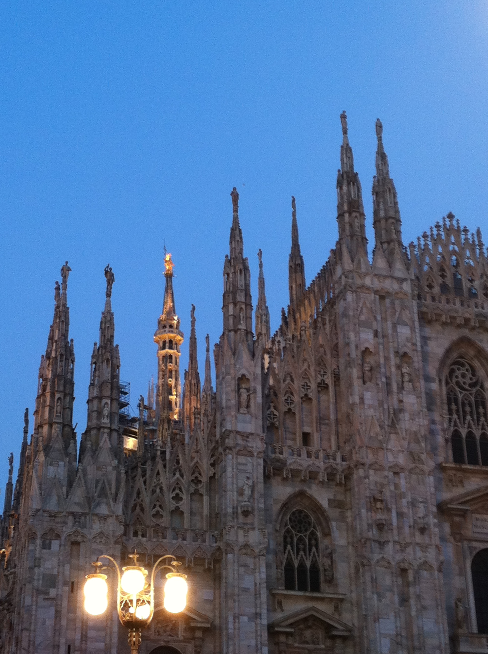 E como nem só de estudos uma viajante pode viver, entre uma folguinha e outra tive tempo de conhecer alguns dos atrativos desta cidade cosmopolita e inspiradora de ideias. E para começar aproveitei o dia da minha chegada para dar uma passadinha pelo Duomo, uma das maravilhas da arquitetura medieval com seu estilo gótico que fica bem próxima à estação central e chama a atenção pela beleza de sua arquitetura e a pequena estátua dourada da santinha “Madonnina” no seu topo que é o símbolo da cidade. A visita ao interior do Duomo é gratuita mas para fotografar é preciso pagar.